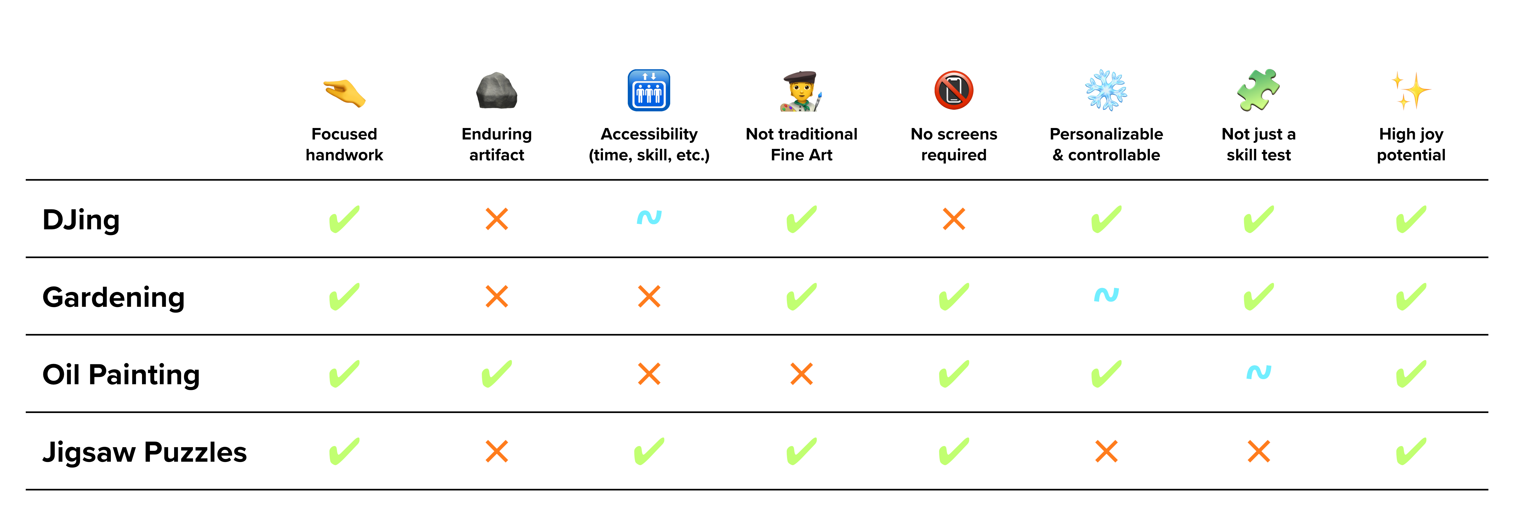 It feels strange to exclude some of these hobbies, and even with our criteria, it feels a little arbitrary and exclusionary. But having a rubric helps us make consistent decisions and stay aligned, and feels more intentional than just picking 30 random hobbies.