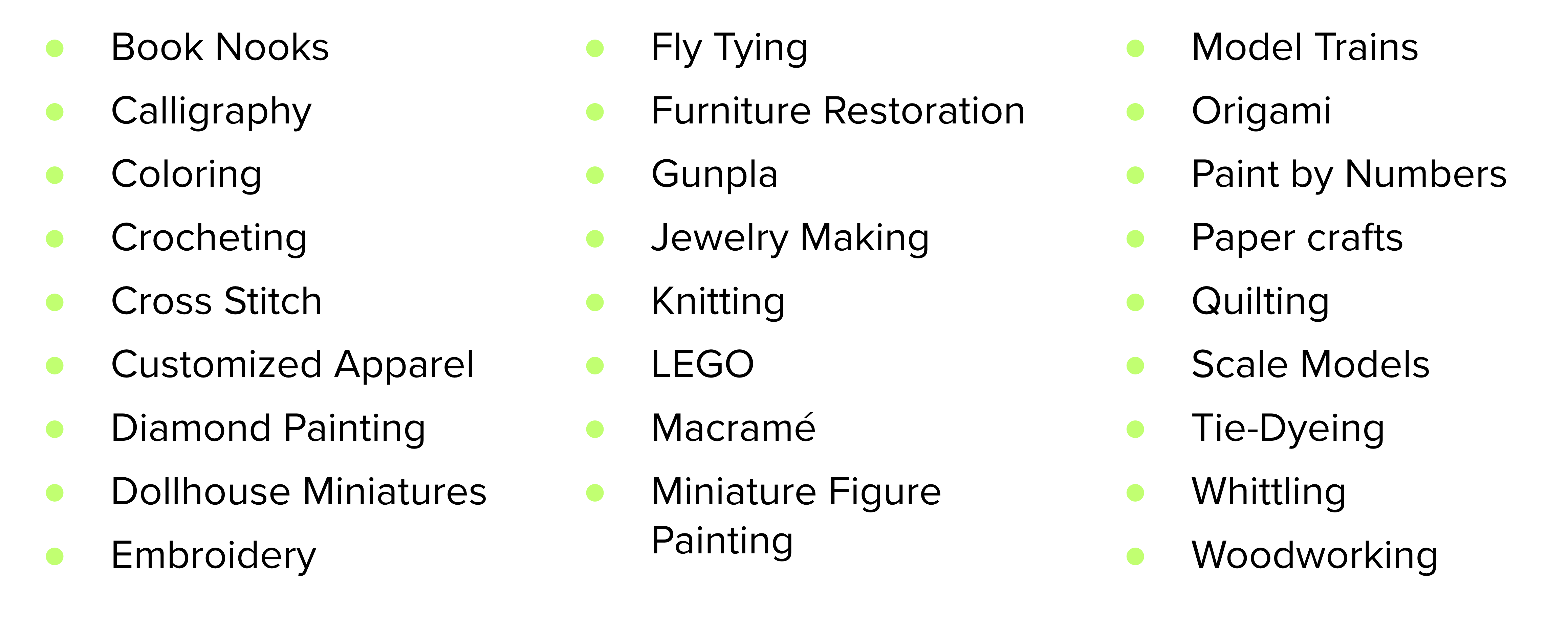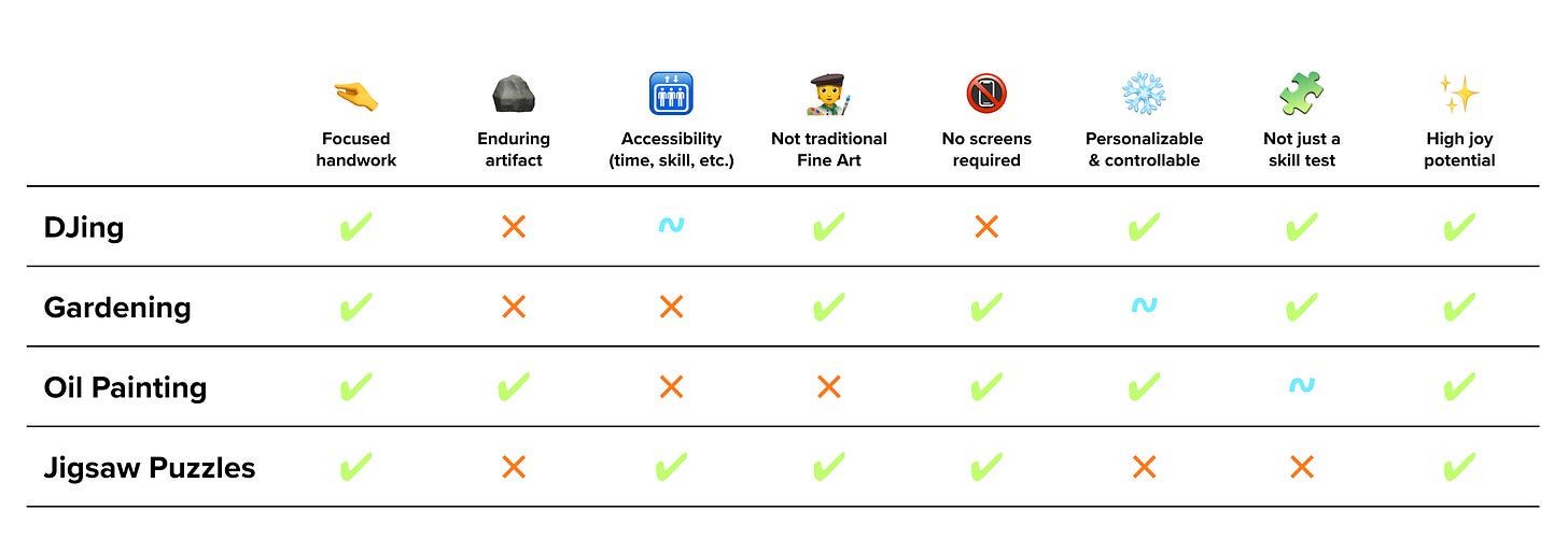 Back to our criteria. We want to maximize the potential for Flow, which means matching users to the right mix of skill and challenge. To do this, we’re avoiding hobbies with high barriers to entry, whether that’s excessive training, specialized skills, or exorbitantly pricey materials. Flow is more attainable with activities that have clear goals and provide a sense of progress, so we’re excluding more conceptual activities and those that take years to complete (looking at you, Bonsai). We also want activities that create something tangible you can display, gift, or experience over time. Cooking, jam making, gardening, and other perishable or seasonal hobbies are, of course, enriching, but their ephemerality means they’re off the list—for now.