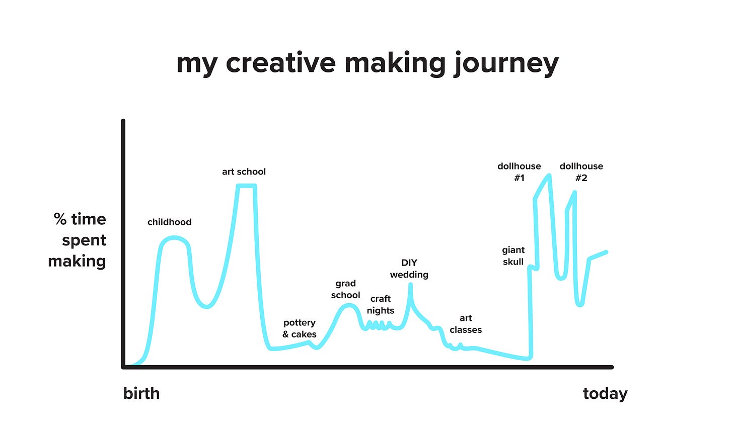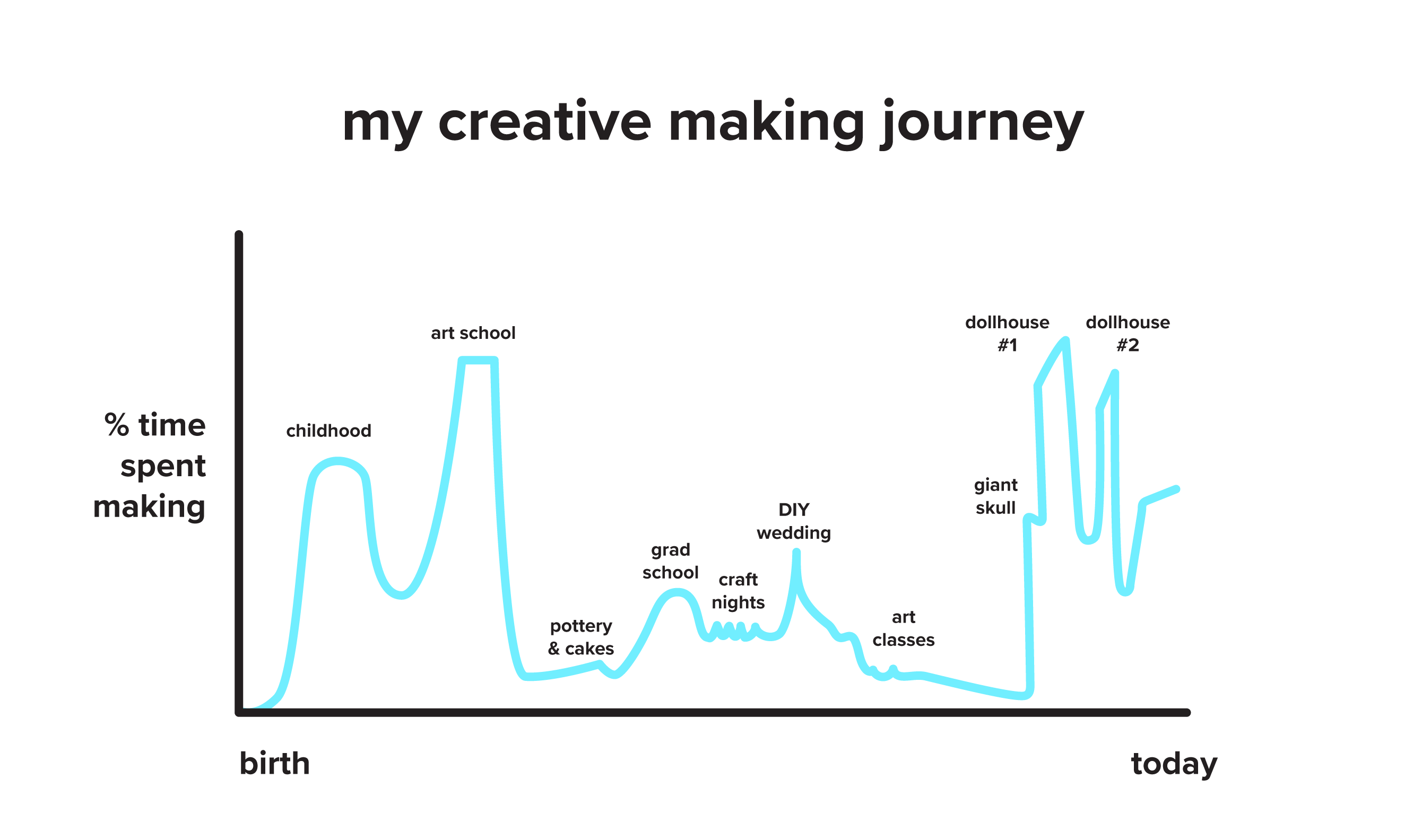 My career got pretty intense, and I basically stopped making stuff outside of work for a few years. It wasn’t until my recent creative sabbatical and discovery of dollhouse making that I found a new steady state. I created so much joy for myself and others that it felt wrong NOT to make. It’s still hard for me to create time and space for creative making, even as a making-obsessed, childfree, part-time consultant. If I don’t schedule time, I don’t do it. But when I do, I never regret it.