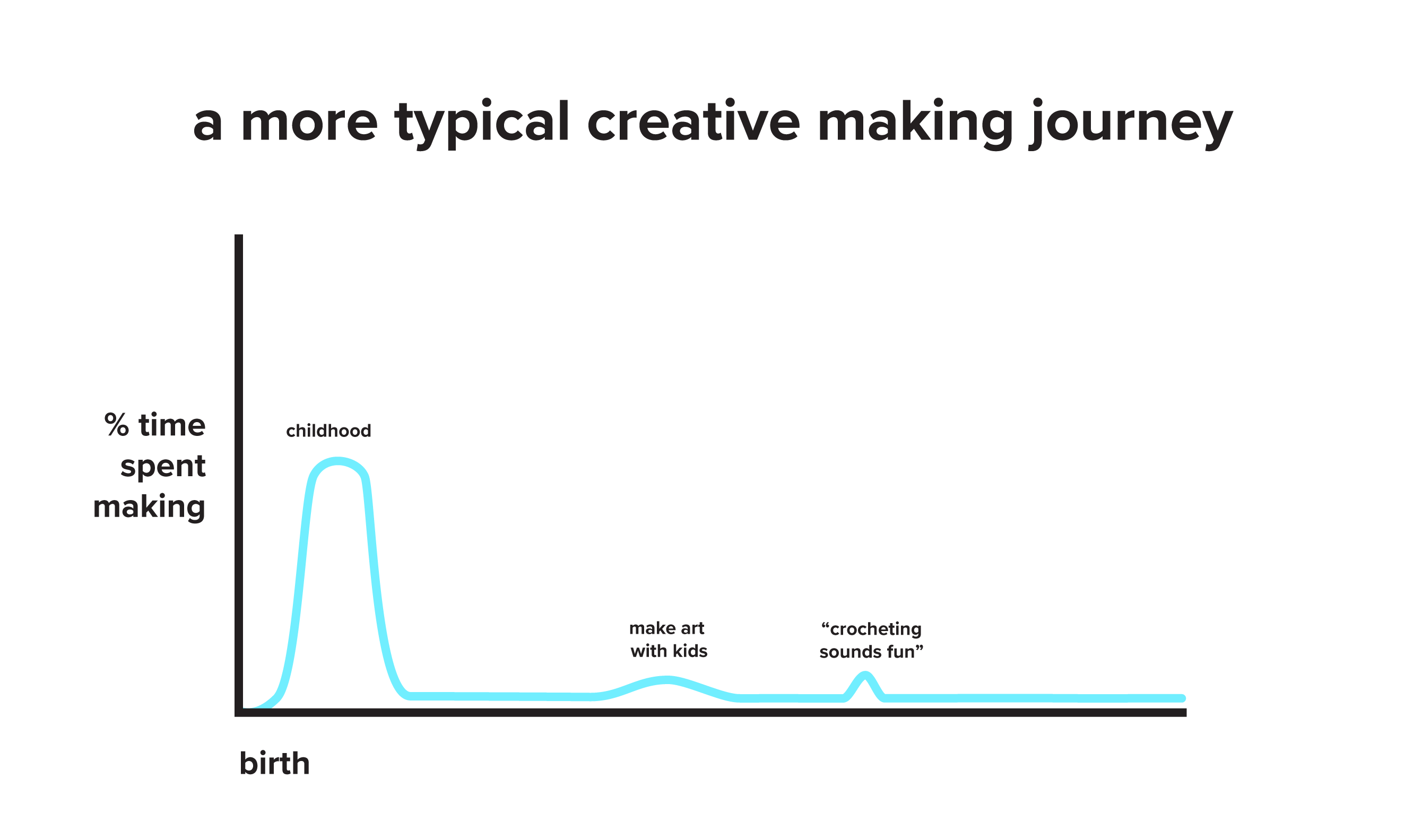 I fully acknowledge that my experience with creative making is atypical. Not everyone has the intrinsic urge to make things, or the time, space, and resources to do so. Many people (sadly) gave up on creative making as kids. If you want to go down a depressing rabbit hole, research why kids stop making art. Here’s the tl;dr: children tend to discover art, get really into it, and then, as they reach “The Age of Reason,” they just…stop.