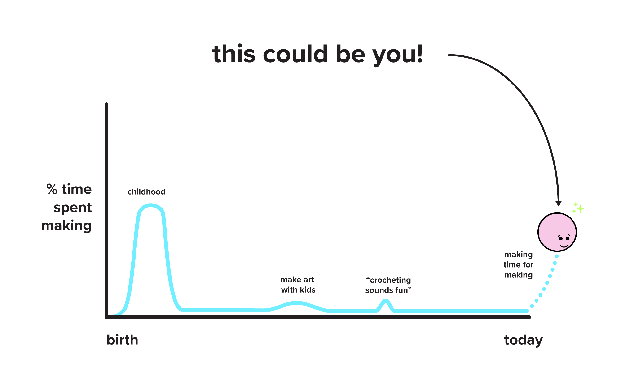 After childhood, there may be a few blips in a person’s creative journey as they make art and do crafts with their own kids (or those of friends and family members). Maybe there’s even a creative hobby that they give a whirl. But, for many, their creative making journey basically ends when they turn nine. This makes me sad!