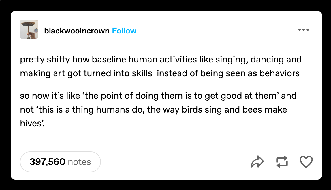 It dawned on me that my life has always been about creativity and the joy it creates (this of course was obvious to my husband, career coach, and friends…but somehow I missed it 🤦🏻♀️). And it’s always bothered me that creative hobbies are seen as frivolous, childish, or as an activity reserved for professional Artists (with a capital A) or solely capitalist pursuits. When, in reality, being creative “is a thing humans do, the way birds sing and bees make hives.”